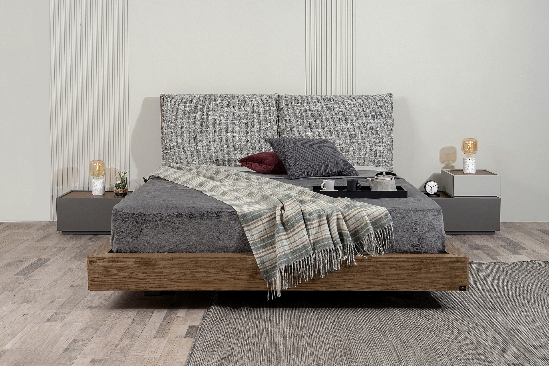 Το κεφαλάρι αποτελείται από δύο μεγάλες, άνετες μαξιλάρες, προσφέροντας εξαιρετική στήριξη για χαλάρωση, διάβασμα ή τηλεόραση. Η κρυφή βάση, χωρίς ορατά πόδια, δίνει στο κρεβάτι την αίσθηση ότι αιωρείται, ενώ παράλληλα επιτρέπει την εύκολη διέλευση της σκούπας από κάτω, κάνοντας την καθημερινότητα πιο πρακτική.