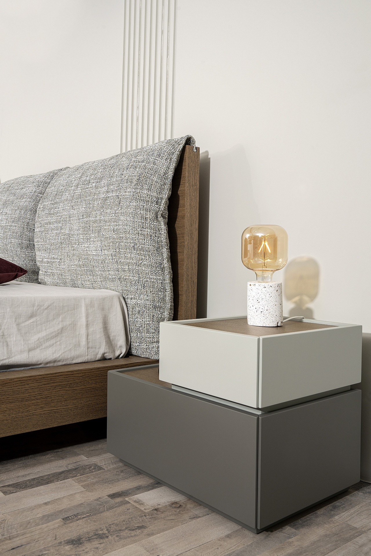 Το πρώτο κομοδίνο διαθέτει ένα συρτάρι σε γκρι χρώμα, με επιφάνεια από ξύλο σε απόχρωση μελί, προσφέροντας καθαρή και minimal εικόνα.