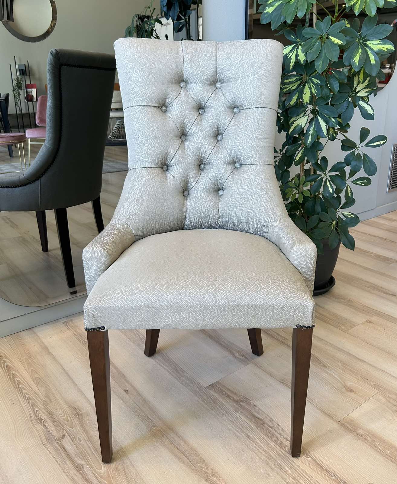 Διαθέτει πλούσιο καπιτονέ κάθισμα, ντυμένο με μπεζ γυαλιστερό ύφασμα, που προσδίδει αίσθηση πολυτέλειας και φωτεινότητας. Η πλάτη διακοσμείται με καμπαράδες, ενισχύοντας τον αρχοντικό χαρακτήρα της καρέκλας, ενώ τα μασίφ ξύλινα πόδια σε καφέ απόχρωση προσφέρουν στιβαρότητα και διαχρονικότητα.