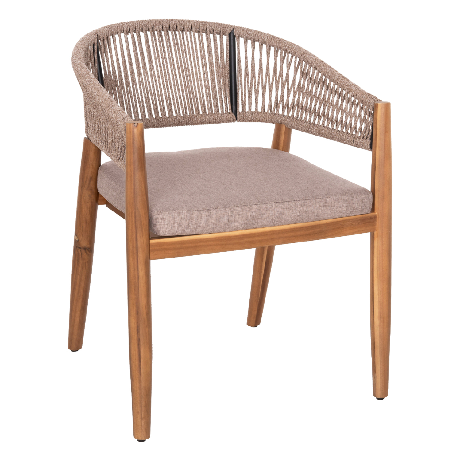 Η πλάτη διαθέτει μεταλλικό σκελετό με πλέξη από nylon σχοινί σε μπεζ απόχρωση, προσφέροντας μοντέρνο χαρακτήρα και αίσθηση ελαφρότητας. Το κάθισμα συμπληρώνεται από μαξιλάρι με πολυεστερικό ύφασμα επίσης σε μπεζ τόνο, ενισχύοντας την άνεση.