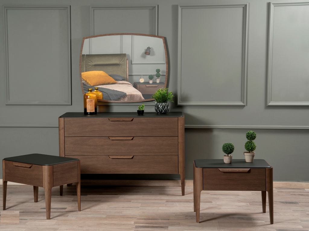 Διαθέτει ένα ευρύχωρο συρτάρι, ιδανικό για αποθήκευση προσωπικών αντικειμένων, προσφέροντας πρακτικότητα και αισθητική ισορροπία. Ο minimal σχεδιασμός του ταιριάζει αρμονικά τόσο σε μοντέρνες όσο και σε κλασικές κρεβατοκάμαρες, ενώ μπορεί να συνδυαστεί με τη συρταριέρα ή τουαλέτα της ίδιας σειράς για ένα ολοκληρωμένο αποτέλεσμα.