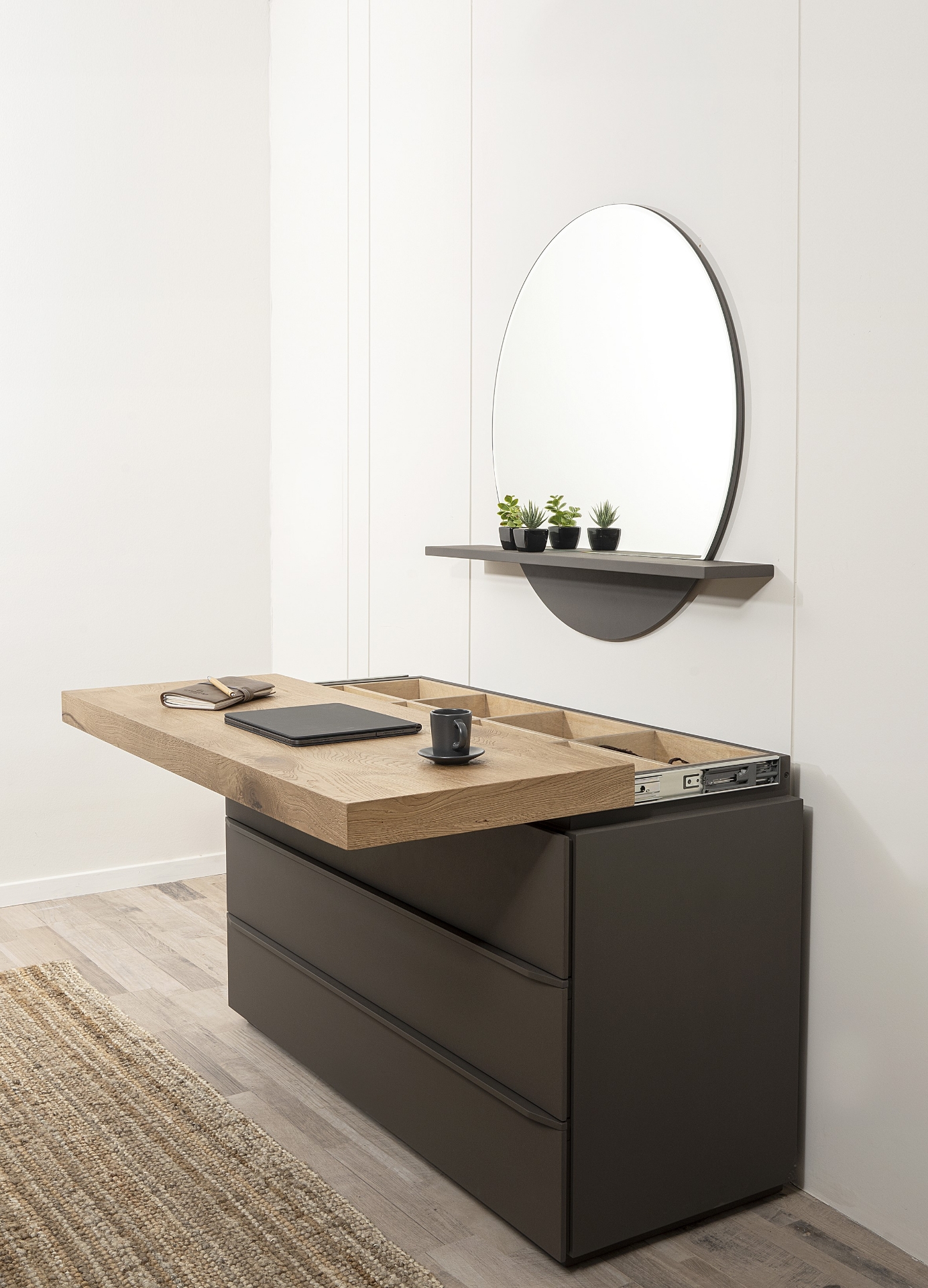 Το πάνω μέρος της τουαλέτας είναι συρόμενο, αποκαλύπτοντας έναν έξυπνο αποθηκευτικό χώρο-ράφι, ιδανικό για κοσμήματα, αξεσουάρ ή προσωπικά αντικείμενα. Η πρωτοποριακή αυτή λεπτομέρεια αναδεικνύει τον λειτουργικό χαρακτήρα του επίπλου, προσφέροντας ευκολία χωρίς να θυσιάζει την αισθητική.
