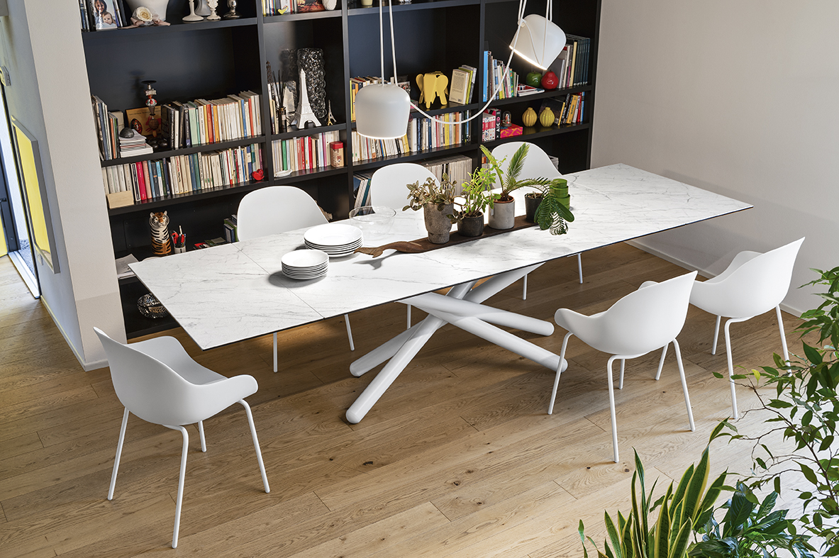 Ένα για όλους και όλα για έναν: τα τέσσερα σκέλη του τραπεζιού Duel είναι σαν υπερμεγέθη συμπλεγμένες λεπίδες με ξιφοειδή κεφαλή με διασταυρούμενη αρχιτεκτονική διάταξη σωλήνων κυκλικής διατομής που συναντώνται στα άκρα. Οι επιφάνειες τραπεζιών, διαθέσιμες σε διάφορα μεγέθη και φινιρίσματα, στηρίζονται σε μεταλλική και είναι κατάλληλες για εσωτερικούς και εξωτερικούς χώρους. Η γλυπτική ομορφιά αυτού του κομματιού έχει επιτευχθεί με μια αντίθεση μεταξύ του δυναμισμού της βάσης και της σταθερότητας των οριζόντιων γραμμών, και από την τολμηρή παρουσία των ποδιών και την απλή γοητεία της επιφάνειας του τραπεζιού. Το τραπέζι Duel είναι ιδανικό για να συγκεντρωθούν οι φίλοι και η οικογένεια και είναι βέβαιο ότι θα τραβήξει τα βλέμματα των ανθρώπων με την αρχική του αίσθηση.