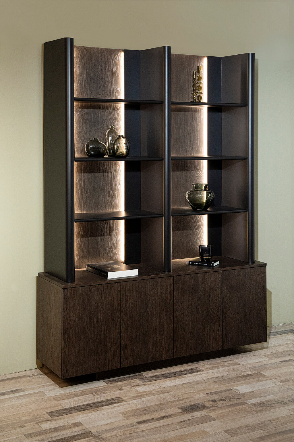 Η βιβλιοθήκη Luma αποτελεί μια σύγχρονη βιβλιοθήκη σαλονιού που συνδυάζει υψηλή αισθητική με προηγμένη λειτουργικότητα. Ο σχεδιασμός της ενσωματώνει ανοιχτά ράφια για βιβλία και διακοσμητικά, καθώς και κλειστό αποθηκευτικό χώρο στο κάτω μέρος, τύπου μπουφέ, ιδανικό για την οργάνωση αντικειμένων που θέλετε να παραμένουν εκτός οπτικού πεδίου. Η χρήση ξύλου δρυς σε συνδυασμό με λάκα προσδίδει φυσική ζεστασιά και μοντέρνο χαρακτήρα, ενώ ο κρυφός φωτισμός με dimmer δημιουργεί ατμοσφαιρικό αποτέλεσμα και αναδεικνύει τη δομή της βιβλιοθήκης. Ο ρυθμιζόμενος φωτισμός επιτρέπει την προσαρμογή της έντασης ανάλογα με τη χρήση και τον φωτισμό του χώρου. Η βιβλιοθήκη Luma λειτουργεί ταυτόχρονα ως βιβλιοθήκη και ως αποθηκευτικό έπιπλο, καλύπτοντας πρακτικές ανάγκες χωρίς να βαραίνει αισθητικά το σαλόνι. Ο κλειστός χώρος στο κάτω μέρος προσφέρει την αίσθηση ενός διακριτικού μπουφέ, ενισχύοντας τη λειτουργικότητα του επίπλου και καθιστώντας το ιδανικό για σύγχρονους και minimal χώρους. Χάρη στον ισορροπημένο σχεδιασμό της, η βιβλιοθήκη Luma ενσωματώνεται αρμονικά σε μοντέρνα σαλόνια, open-plan χώρους ή επαγγελματικά περιβάλλοντα, προσφέροντας αποθήκευση, φωτισμό και design σε ένα ενιαίο έπιπλο υψηλής αισθητικής. Διαστάσεις (εκ): Bιβλιοθήκη 150x40x200 Μπουφεδάκι 150x40x60 (περιλαμβάνεται) Ραφιέρα 140x35x140 Υπάρχει δυνατότητα κατασκευής και σε άλλες διαστάσεις πέραν των εργοστασιακών.